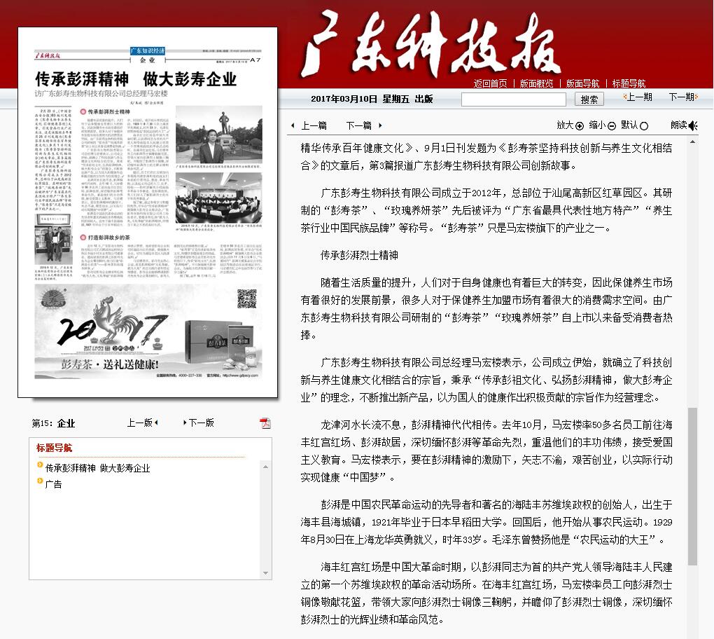 廣東科技報(bào)報(bào)道:傳承彭湃精神 做大彭壽企業(yè)