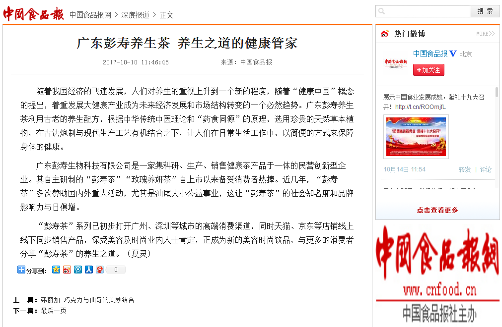 中國食品報報道:廣東彭壽養(yǎng)生茶 養(yǎng)生之道的健康管家