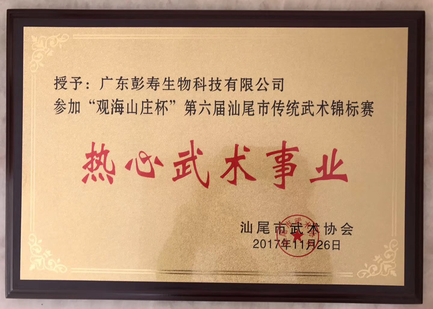廣東彭壽生物科技公司獲頒“熱心武術(shù)事業(yè)”牌匾